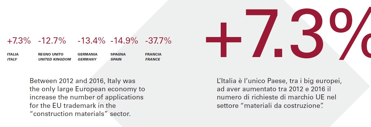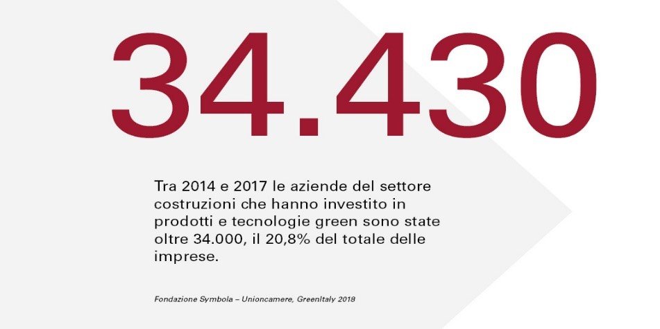 Migliorare materiali e prestazioni risulta indispensabile per ottimizzare gli interventi, così come agire sulla formazione degli operatori sui temi del green building. In futuro, infatti, più che consumare energia, i nostri edifici la produrranno, rendendosi attivi e autosufficienti. Le imprese lo hanno capito: tra 2014 e 2017 le aziende del settore costruzioni che hanno investito in prodotti e tecnologie green sono state oltre 34.000, il 20,8% del totale delle imprese. L’Italia è l’unico, fra i big europei, ad aver aumentato tra il 2012 e il 2016 il numero di richieste di marchio UE nel settore “materiali da costruzione” con un +7,3%; contro -13,4% della Germania e -37,7% della Francia.