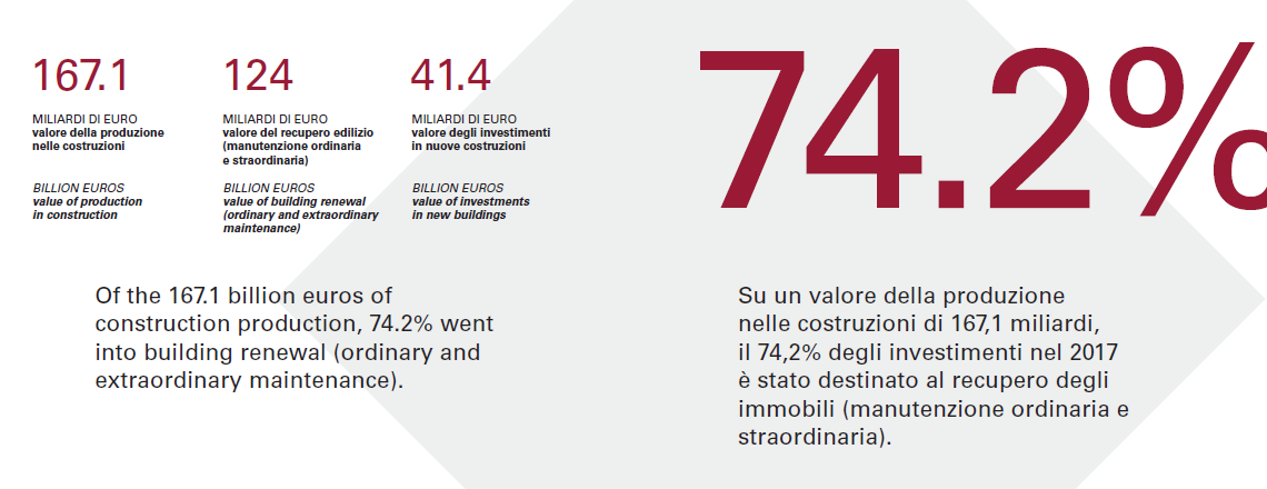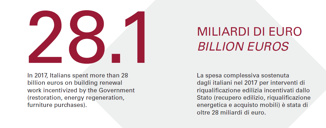 Negli ultimi anni in Italia sono stati attivati incentivi fiscali che mirano a sostenere la riqualificazione nel comparto immobiliare. Al consolidato Ecobonus (credito di imposta per ristrutturazioni e bonus per efficienza energetica) si sono aggiunti il “Sismabonus” e il “Bonus Verde”. Nel 2017 gli incentivi per le ristrutturazioni hanno prodotto più di 28 miliardi di investimenti attivando oltre 418 mila posti di lavoro tra diretti e indotto.