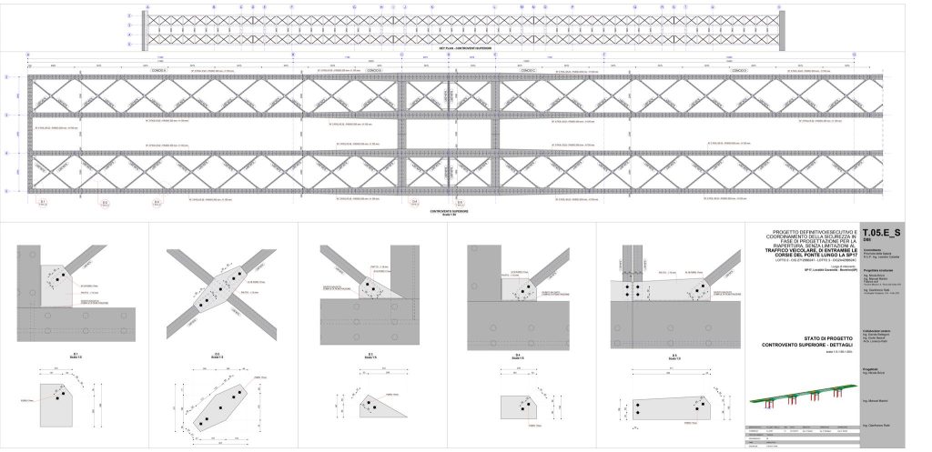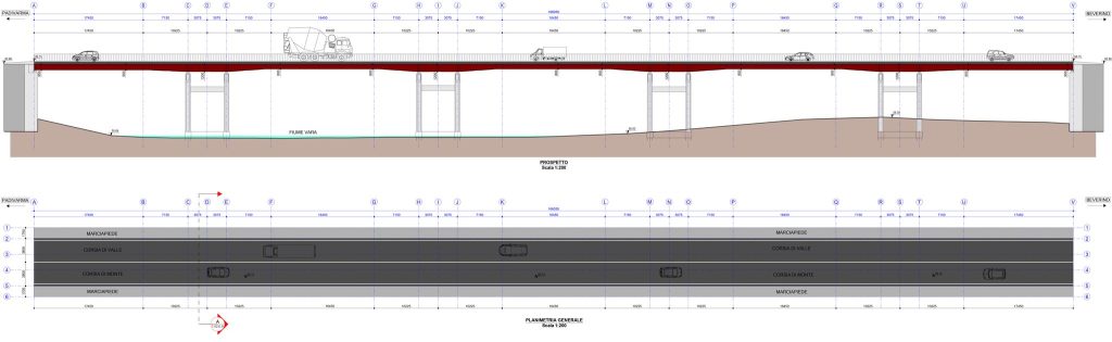Il progetto prevede la realizzazione di un nuovo impalcato a travata continua con sezione mista acciaio-calcestruzzo. Il nuovo impalcato metallico si svilupperà su una lunghezza complessiva di circa 166m e sarà composto da quattro travi in acciaio. L’intera commessa è stata gestita con il software BIM di modellazione strutturale Tekla Structures, che ha permesso di modellare lo stato di fatto e lo stato di progetto del ponte. Tramite link diretti e bidirezionali è stato possibile interagire con il software MIDAS GEN dove è stato realizzato un modello di calcolo agli elementi finiti che ha consentito di verificare se l’impalcato fosse adeguato a sostenere i carichi da traffico previsti dalla normativa vigente.