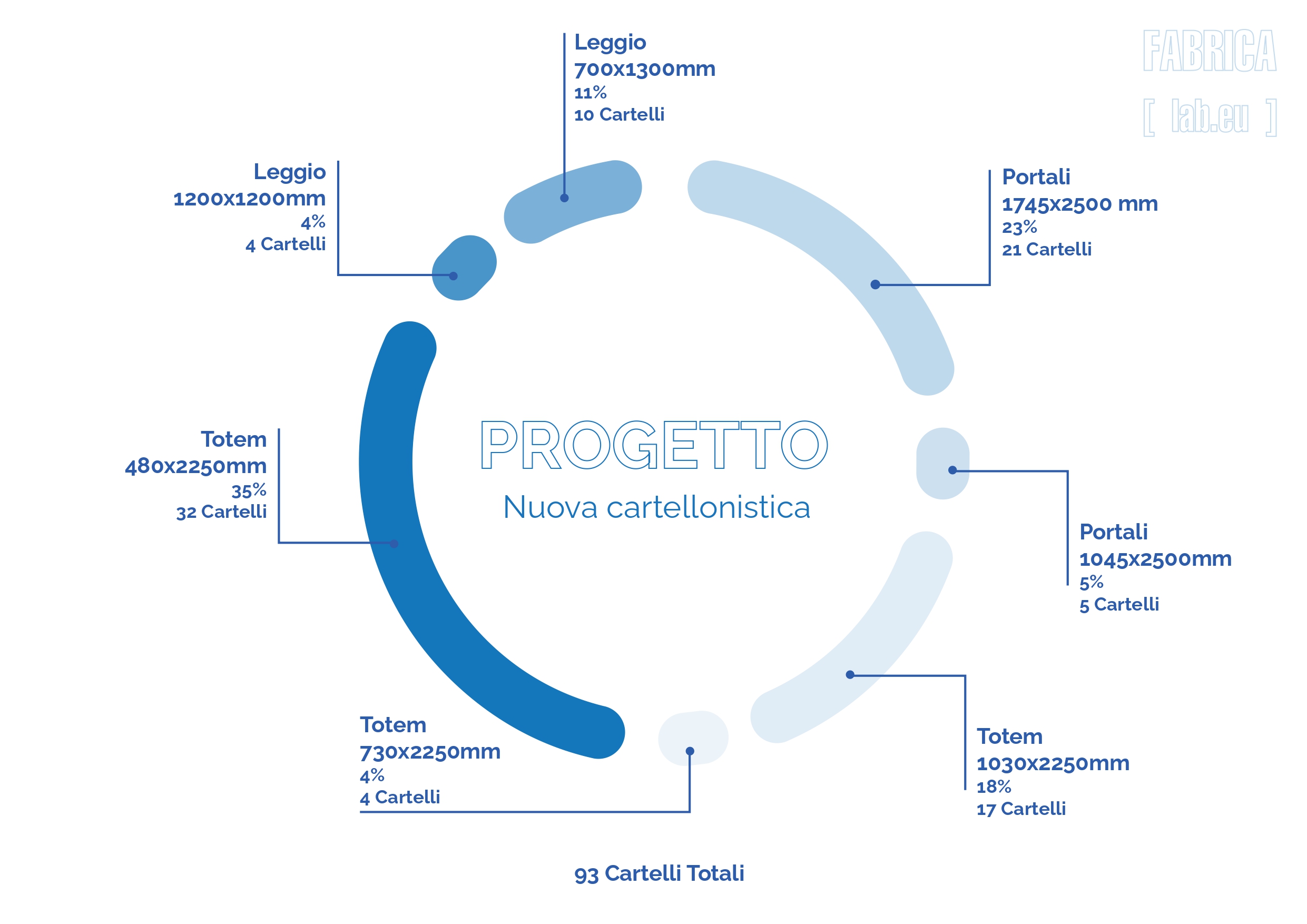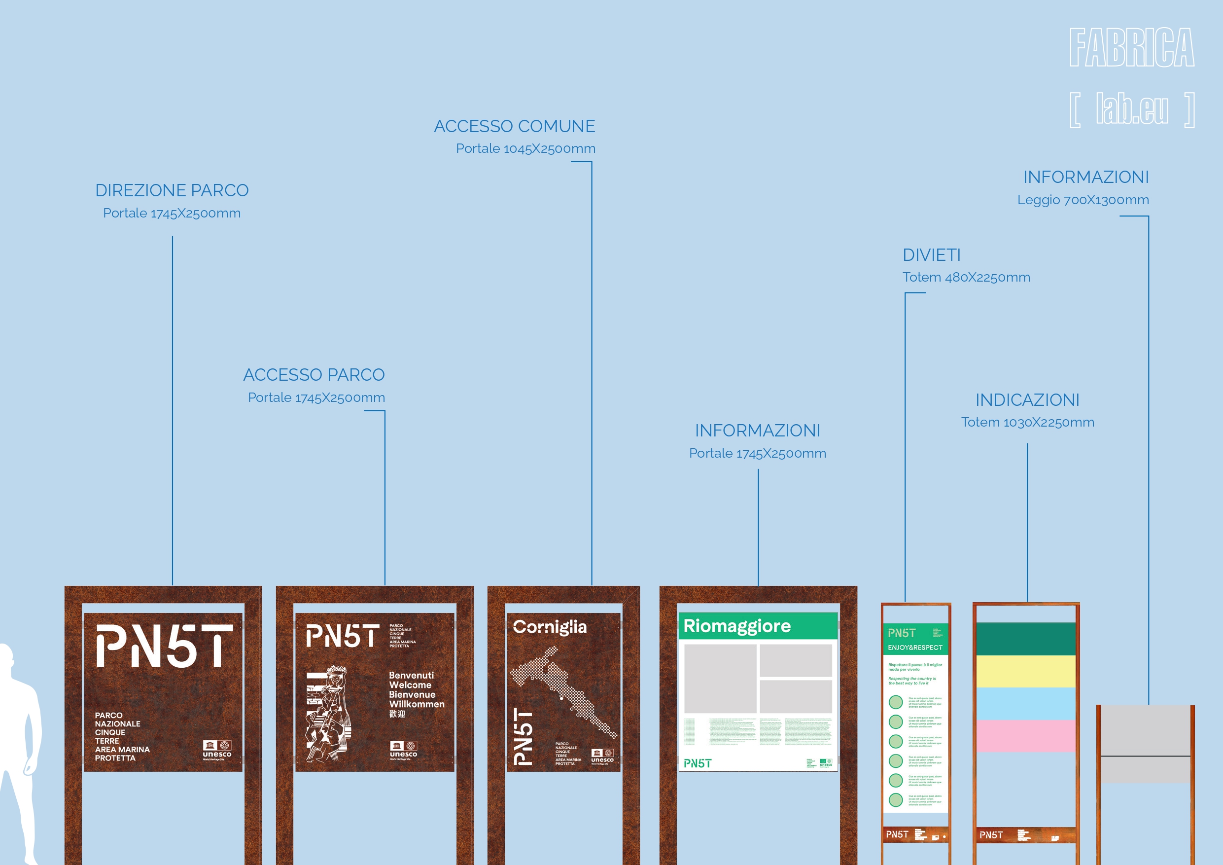 Il progetto nel suo insieme consiste quindi nella realizzazione di una nuova segnaletica unitaria di riferimento composta da circa 90 tra cartelli di orientamento, di benvenuto, informativi e di divieto pensata in modo semplice ed intuitivo e che dimostri allo stesso tempo particolare attenzione al luogo in cui questa viene collocata anche grazie a supporti dal design semplice e a bassa manutenzione in acciaio corten (portali, totem e leggii) collocati in campo in tre successive fasi e pensati per una facile identificazione e lettura delle informazioni.