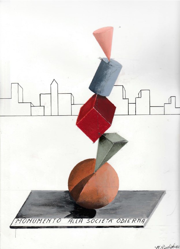L’opera di Rodighiero, dal titolo “Pensando alla società odierna”, nasce dalla volontà dell’artista di rappresentare l’equilibrio precario che la società sta vivendo. “Guerre in tutto il mondo con il loro carico di sofferenze, di morti innocenti, di miseria! Spiega l’artista. Corruzione dilagante, eccessivo amore per il denaro, spiega l’artista. Chi ha causato tutto questo? – certamente l’uomo e la società in cui vive. Eppure basterebbe solo applicare la solidarietà e l’amore universale. Un abbraccio quando è necessario, una parola di conforto, un aiuto a chi ne ha bisogno.
