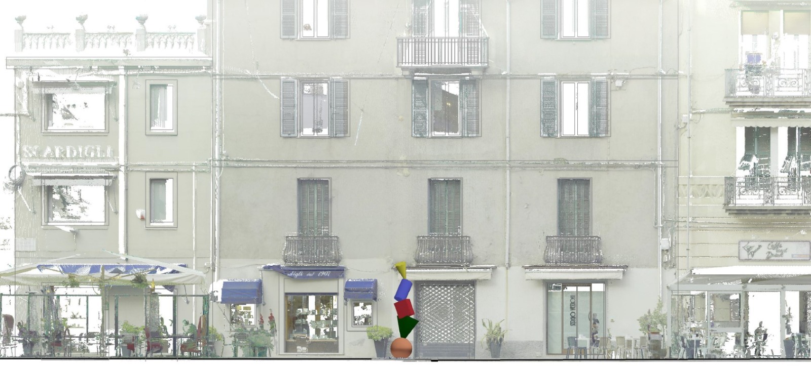 Per garantire l’integrazione dell’opera nel suo ambiente, è stata eseguita una scansione con Laser Scanner Leica RTC360 della piazza destinata ad ospitarla. La nuvola di punti ottenuta è stata importata nel software di authoring utilizzato per la modellazione della statua, permettendo di collocare virtualmente il modello 3D nell’ambiente rilevato. Questo passaggio è stato fondamentale per studiare l’opera in relazione al contesto circostante, generando viste e simulazioni dettagliate.