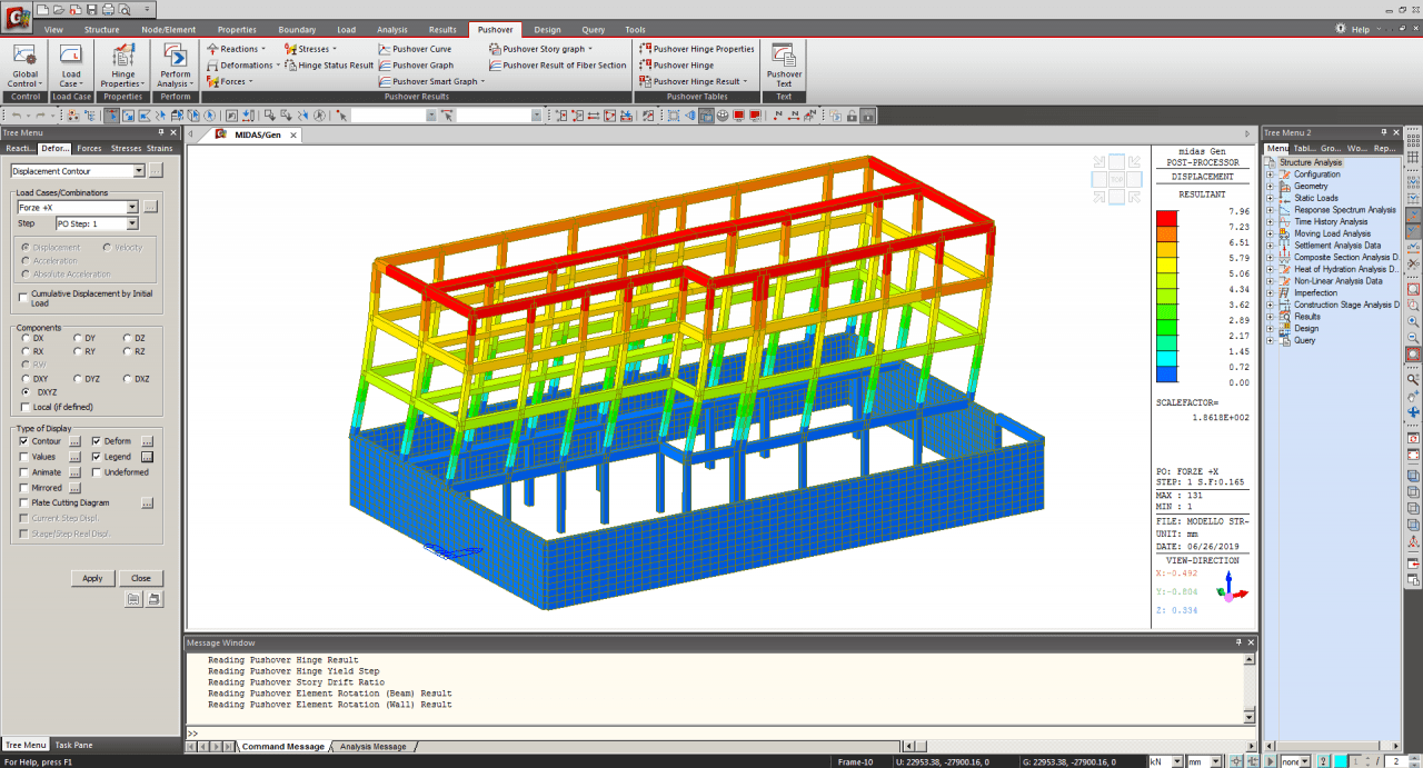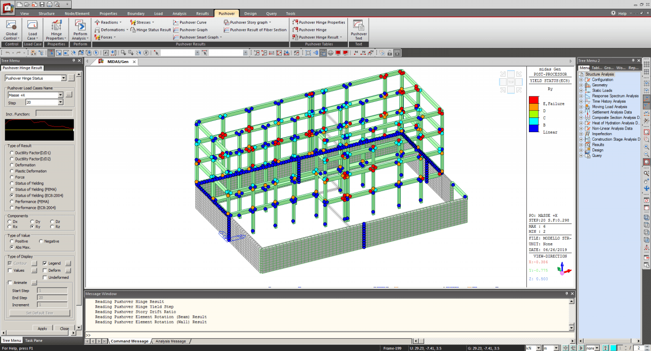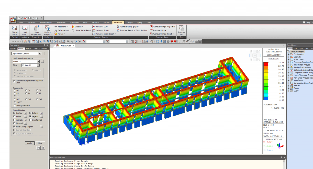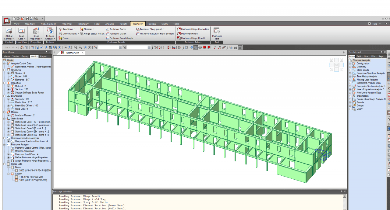 La modellazione delle strutture è eseguita mediante il programma agli elementi finiti MIDAS Gen con cui si effettua un’analisi statica non lineare di tipo Pushover in controllo di spostamento.