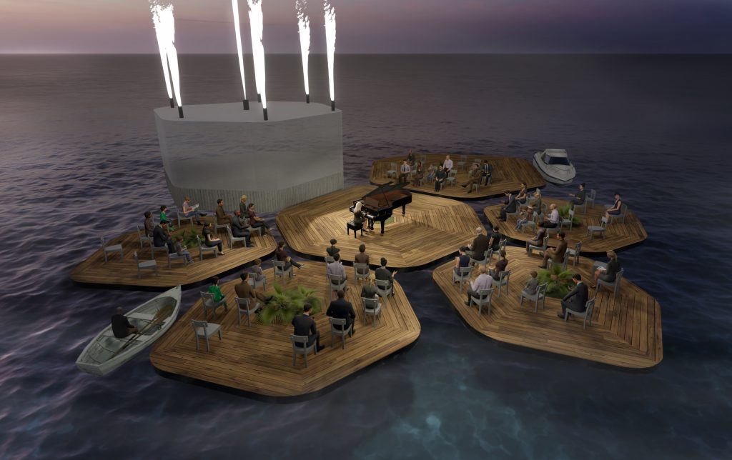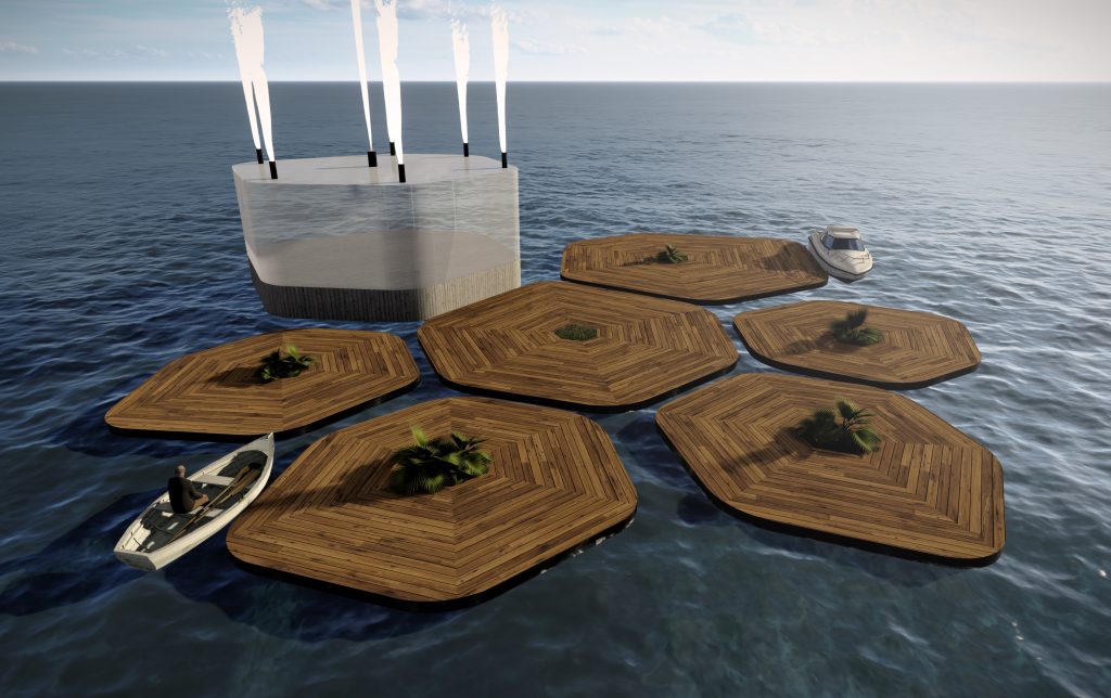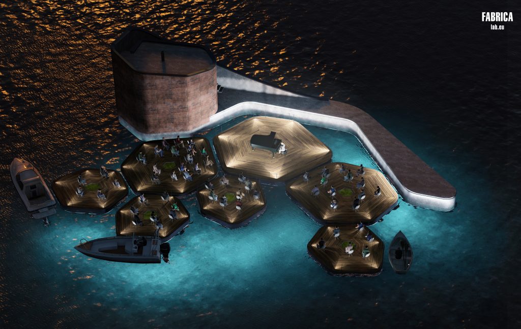 Già in una prima fase di progetto oltre al corpo principale, sono state previste delle piattaforme galleggianti accessorie configurate in modo che potessero essere aggregate ed attrezzate a seconda dell’uso, accanto alle necessarie dotazioni ed installazioni legate al rispetto delle norme vigenti ed alle necessità di attracco per motivi manutentivi. La compatibilità delle diverse isole galleggianti in diverse configurazioni spaziali determina quindi la possibilità di modulazione degli spazi a disposizione, ampliandoli o rimpicciolendoli a seconda delle necessità o delle stagioni. Tale condizione determina quindi anche la possibilità di poterle trasportare in punti meno esposti nella stagione invernale o di poterle tirare in secca e stoccarle secondo necessità. Le configurazioni possono essere molteplici e rappresentare una matrice esportabile anche in altre zone dello specchio acqueo all’interno della diga, come pontili d’attracco o di sosta e quale preludio al raggiungimento delle piattaforme galleggianti poste a servizio ed a contorno della Fontana del Golfo. Gli elementi aggiuntivi galleggianti, ancorati autonomamente al fondale, possono avere funzioni dirette di supporto e servizio a quelle tecnologiche e scientifiche collocate nel nucleo rigido fondato su pali, così come essere utilizzate per attività sociali, culturali o di rappresentanza nei periodi di interruzione del getto d’acqua verticale.