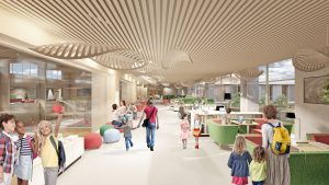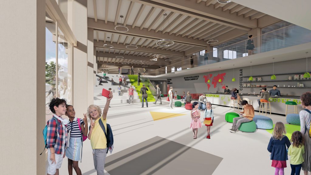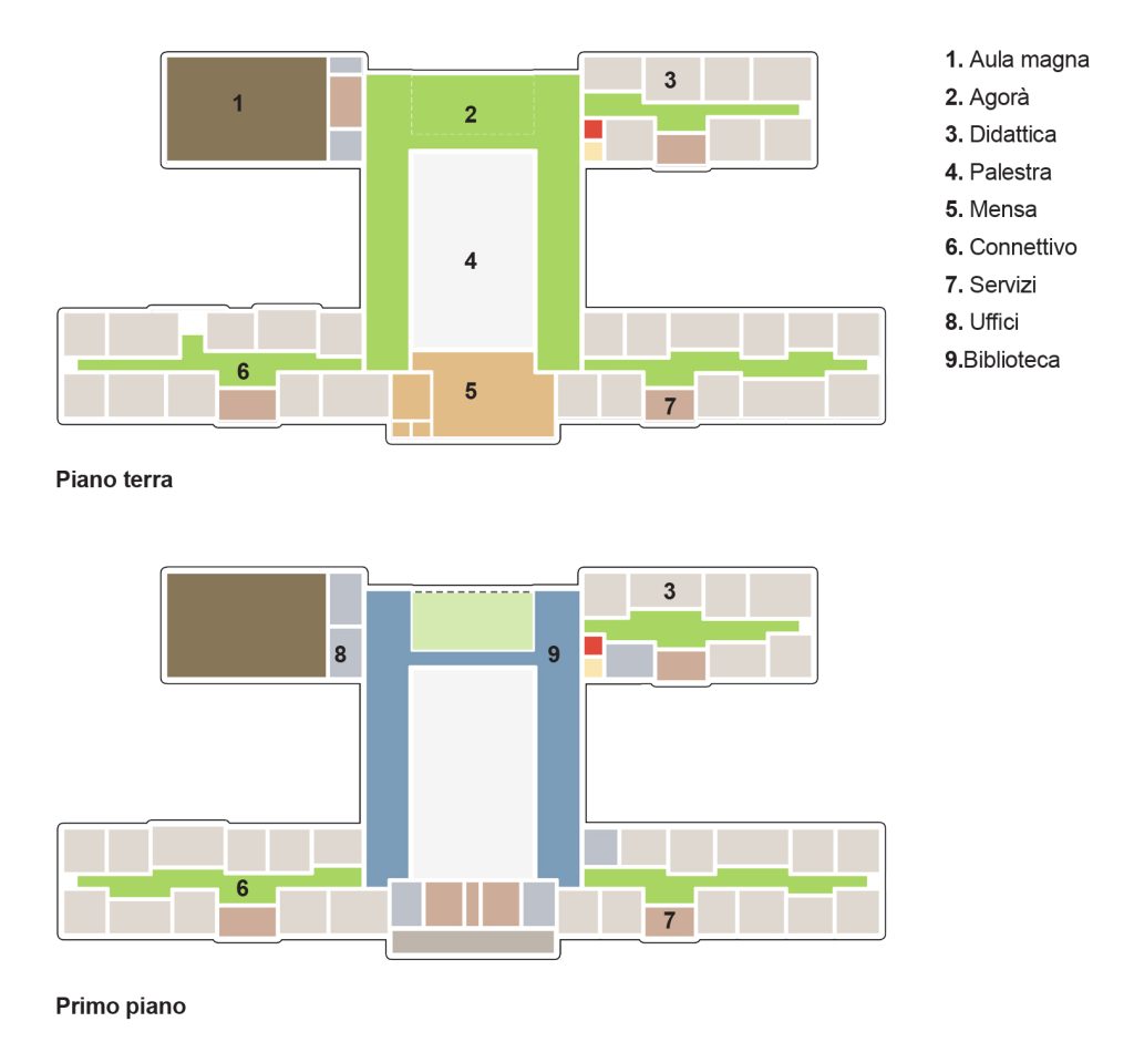 Lo spazio connettivo viene quindi pensato con più come mero spazio di distribuzione, ma come spazio ampliato capace di racchiudere altre diverse funzioni tra le quali quelle di civic center, agorà, zona di socializzazione, biblioteca diffusa e spazio di mediazione tra studenti dei vari cicli scolastici e collettività, diventando luogo di apprendimento non solo teorico, ma strumento reale per modificare l’approccio e l’uso dello spazio e delle sue funzioni da parte degli utenti.
