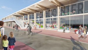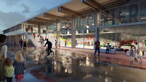Gli edifici scolatici di progetto sono un sistema già percepito come elemento significativo nel contesto sociale ed urbanistico locale, tuttavia la ridefinizione dell’ingresso principale dalla città apre maggiormente gli spazi interni al territorio configurandoli come vero civic center condiviso a partire dalla cavea dell’agorà che sconfina all’esterno creando una significativa continuità d’uso e di percezione tra gli spazi interni e quelli esterni. Al di sotto della parte esterna della scalinata sono poi ricavati spazi per il deposito delle biciclette nelle immediate vicinanze dell’accesso, segnato dalla grande vetrata a doppia altezza che apre verso gli articolati spazi comuni della scuola.