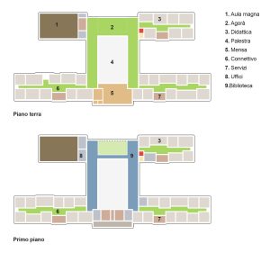 Così i luoghi canonici della scuola e della didattica tradizionale quali aule, corridoi, palestra, diventano spazi permeabili dall’esterno e dall’interno in una condizione di costante intervisibilità, grazie alle ampie vetrate del corpo centrale che si affacciano sulle corti esterne e sulle aree comuni interne in modo che l’ambiente di apprendimento non risulti delimitato dal confine costituito dall’aula e dall’edificio in quanto tale, ma possa allargarsi alle aree ed ai percorsi che lo circondano e lo attraversano.