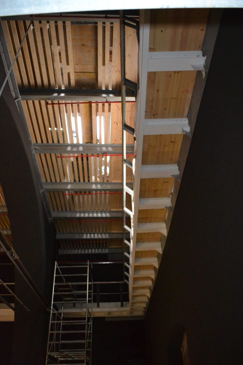 Torre scenica: consolidamento dell’originario impianto fondale dei muri perimetrali, mediante realizzazione di sottofondazioni in c.a. necessarie alla formazione di più ampi e profondi volumi tecnici, senza trascurare il valore storico testimoniale dei rinvenimenti archeologici emergenti quali il pavimento del cortile del Convento nel sottopalco; sostituzione delle strutture orizzontali di palcoscenico con un doppio ordito di profili metallici HEB140 e HEA100, che offrono un appoggio elastico al soprastante piano di calpestio in legno; consolidamento delle murature della torre e delle strutture ad arco interne ad essa, mediante applicazione di betoncino armato con rete in GFRP (glass fiber reinforced polymer), annegata direttamente in un intonaco strutturale, e collegata sulle due facce da barre dello stesso materiale, aumentandone di fatto la capacità portante senza alterarne in modo significativo la rigidezza e il peso; realizzazione di due cordoli esterni in acciaio alla quota del piano di ballatoio e di graticcia, mediante l’accoppiamento di nastri piatti da 400x12mm di spessore, esterni ed interni, connessi da barre M20 disposte a quinconce; rinnovo totale della graticcia, con ordito principale in acciaio e ordito di servizio in legno, poggiante su una struttura verticale reticolare che ha consentito di posizionare la graticcia alla quota necessaria senza interferire con l’arco di boccascena; rinnovo completo della struttura di copertura con travi in legno lamellare e realizzazione contestuale di cordoli in cemento armato di cls alleggerito, che contribuiscono a garantire un comportamento scatolare della muratura senza appesantirla eccessivamente e contenendo la massa in elevazione; nuovo ballatoio a servizio di elettricisti e macchinisti.
