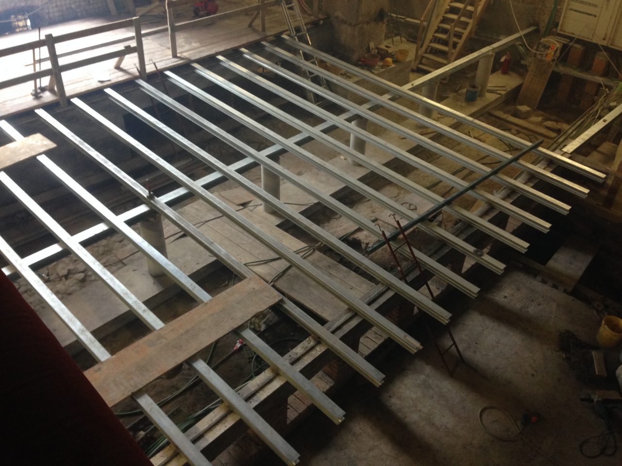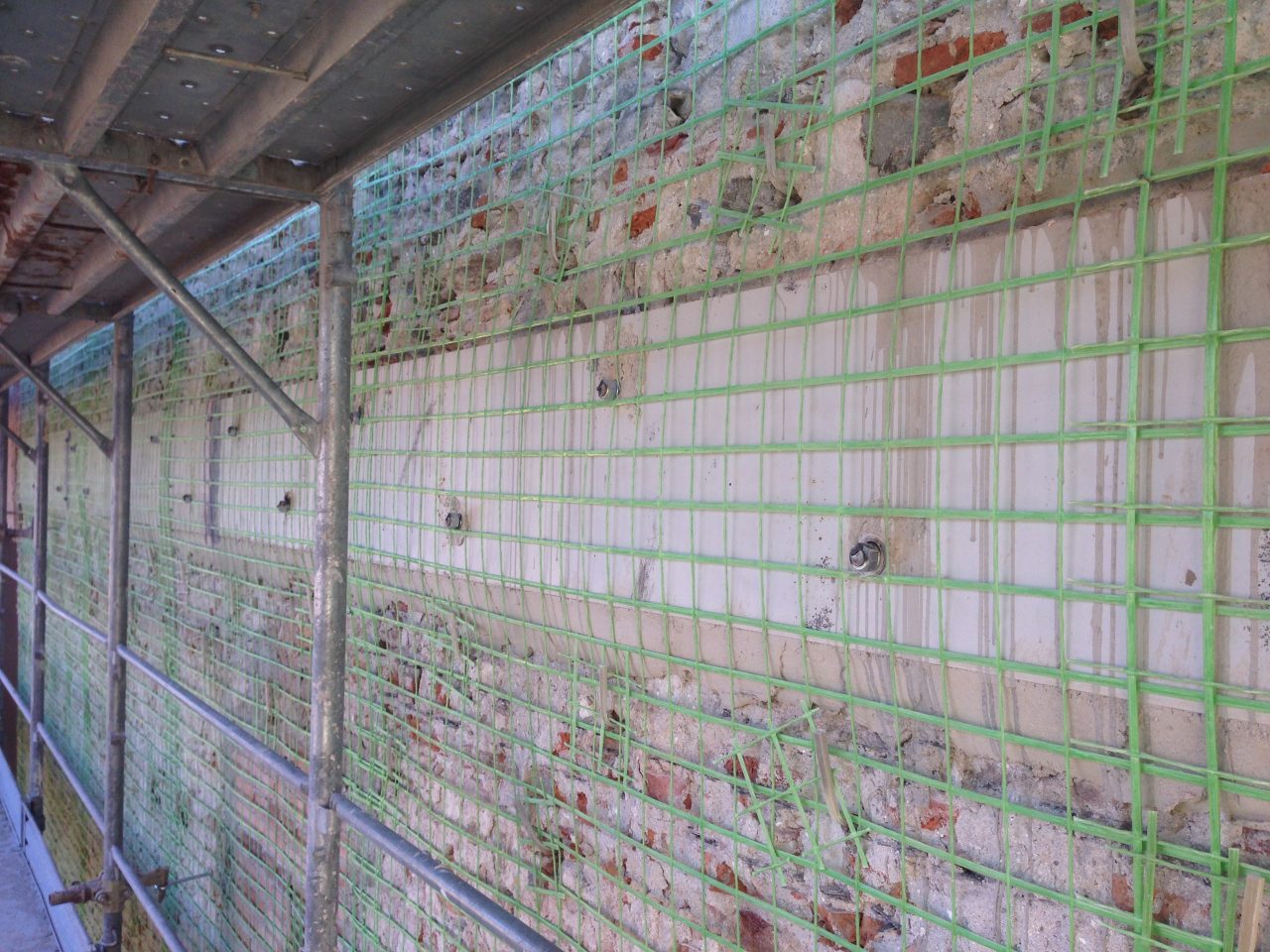 Corpo camerini: totale rinnovo del solaio di piano, con putrelle HEA140 e tavelloni, con realizzazione di collegamenti mediante perforazioni armate perimetrali, realizzate attraverso l’inghisaggio di barre d’acciaio B450C del diametro di 12mm, disposte ogni 50cm, e annegate nella soletta di ripartizione.