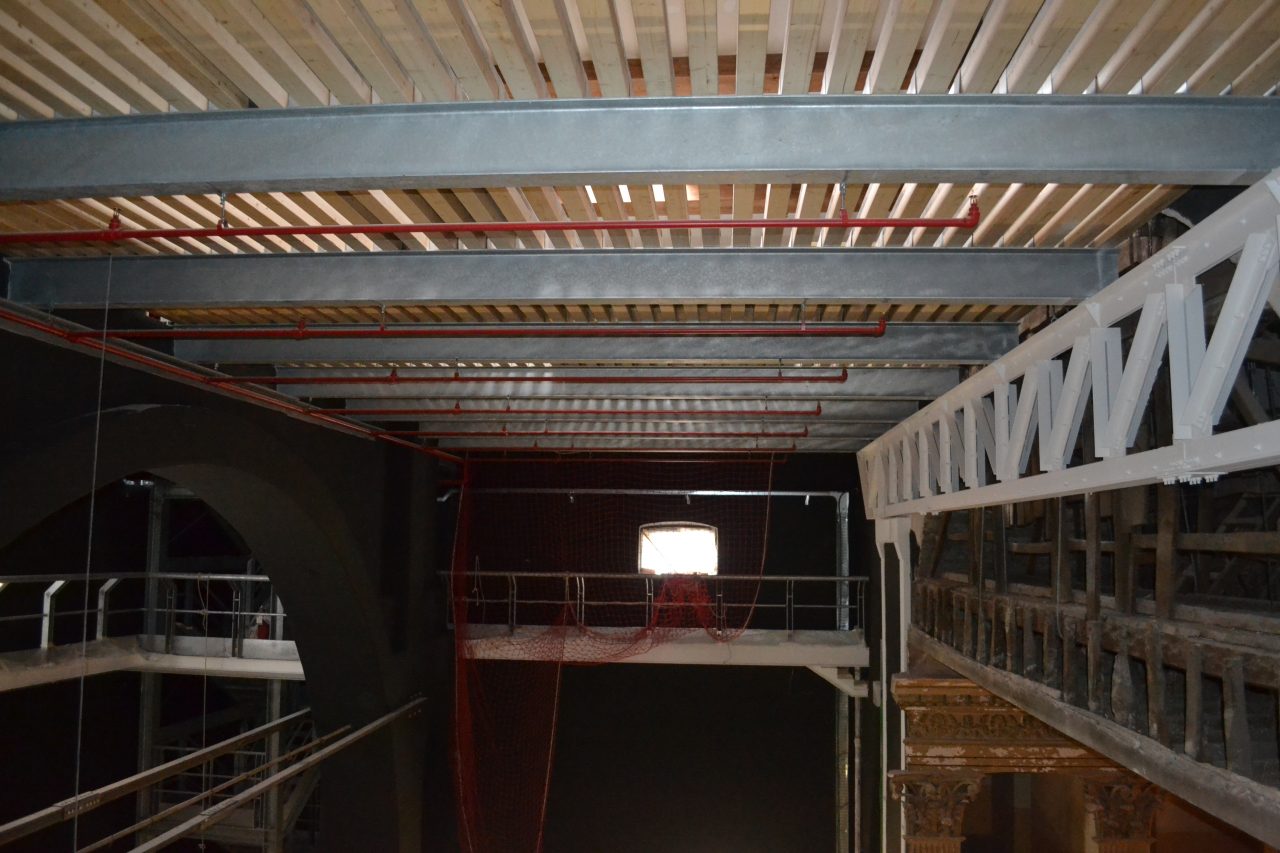 Sala di spettacolo e corpo anteriore: inserimento di cerchiature metalliche nelle due aperture laterali delle vie di fuga a quota platea, rinforzo delle capriate in acciaio esistenti appesantite dalla necessaria pannellatura in calcio-silicato.