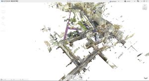 Il pre-allineamento automatico delle scansioni viene perfezionato e verificato, la nuvola di punti viene ‘ripulita’ e ‘decimata’ in funzione degli obiettivi ed il rilievo viene georeferenziato sulla base dei punti GPS acquisiti.