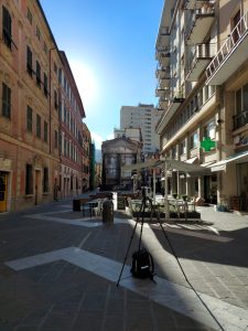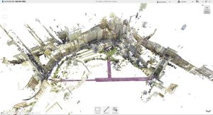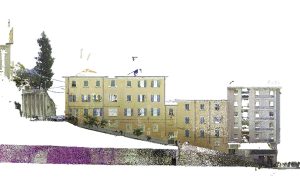Il rilievo del contesto urbano è programmato al fine di sfruttare al meglio le ore di minor affollamento del centro città ed avere quindi l’area di rilievo più sgombera possibile. In questo caso il laser scanner è stato impostato secondo la funzionalità ‘doppia scansione’, settaggio molto utile in tutte quelle situazioni in cui nell’ambiente da rilevare sono presenti mezzi o persone in movimento. Il settaggio ‘doppia scansione’ identifica, riconosce ed elimina i punti che tra le due scansioni hanno subito uno spostamento.