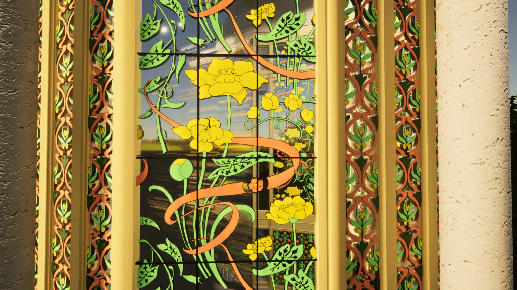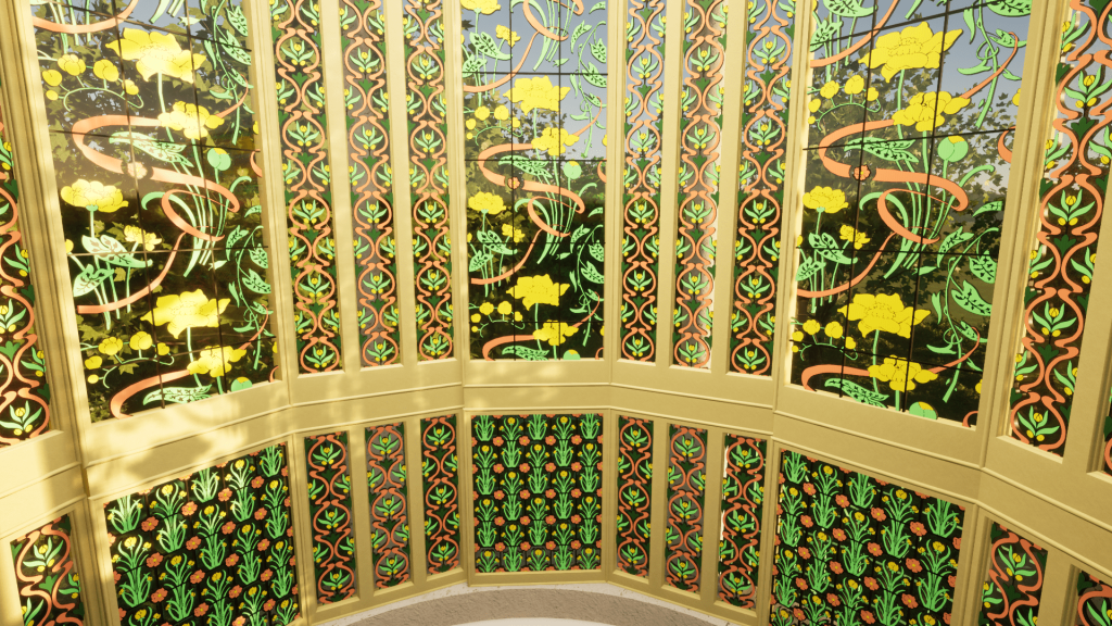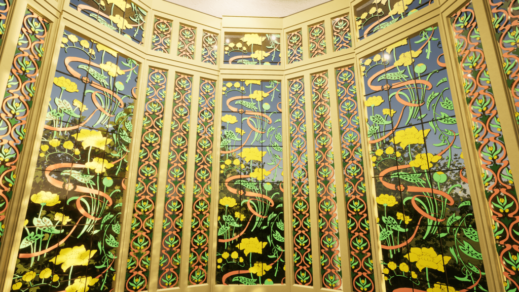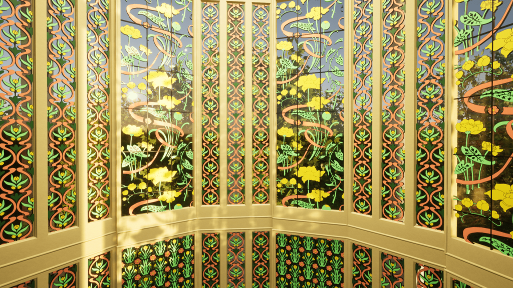 Per questo motivo, una parte significativa del processo di modellazione ha riguardato la “ricostruzione digitale” delle vetrofanie originarie secondo l’interpretazione di alcuni dati ed immagini storiche uniti all’analisi delle ormai limitate tracce delle decorazioni originarie e all’identificazione dei loro pigmenti.