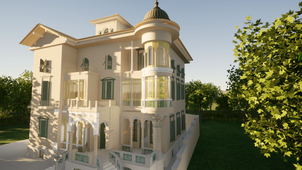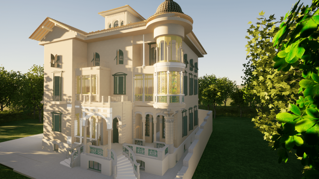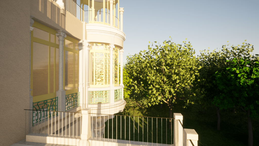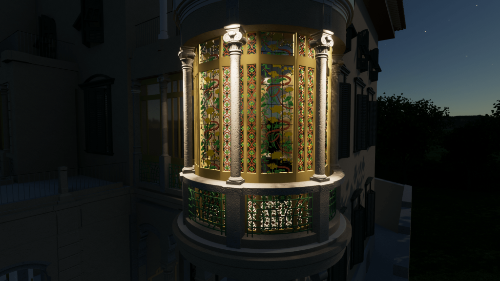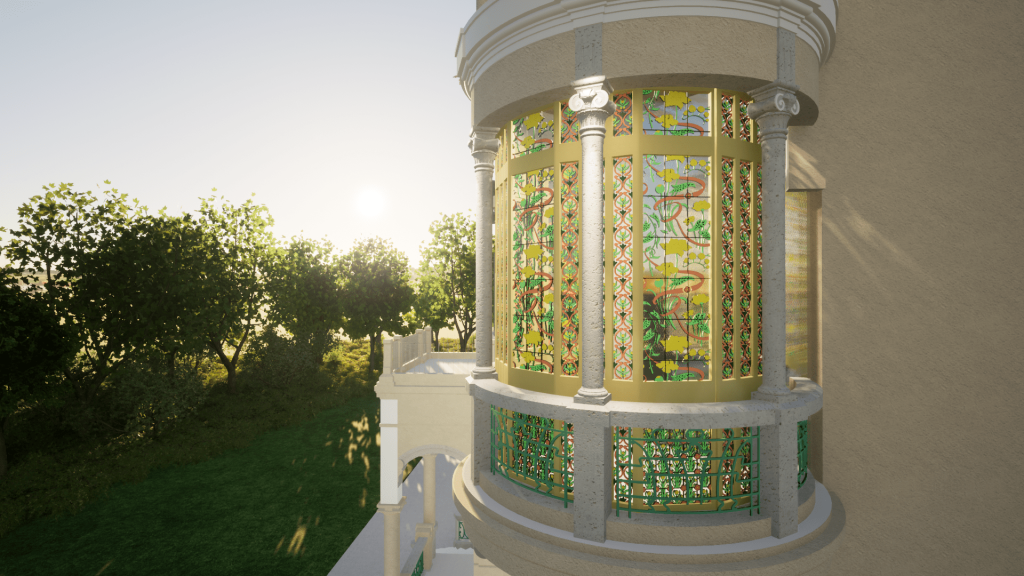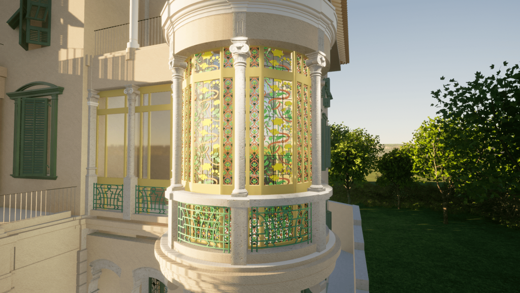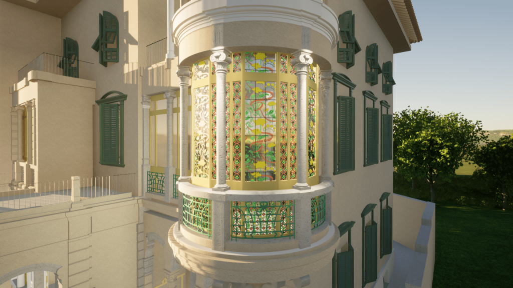 Sulla base del rilievo e della restituzione BIM dello stato di fatto è possibile ricostruire virtualmente il bow window liberty della villa secondo le sue decorazioni originarie.