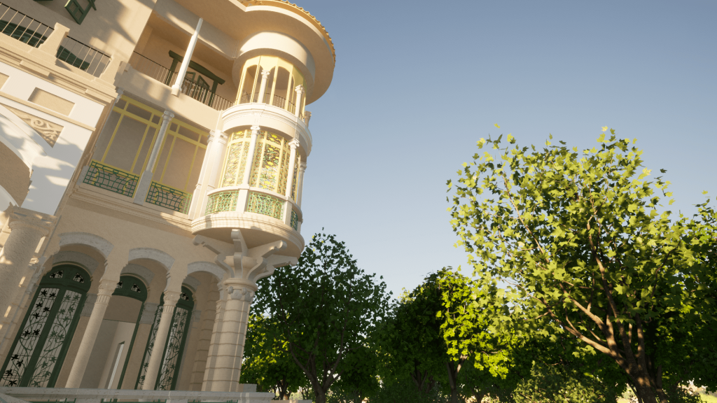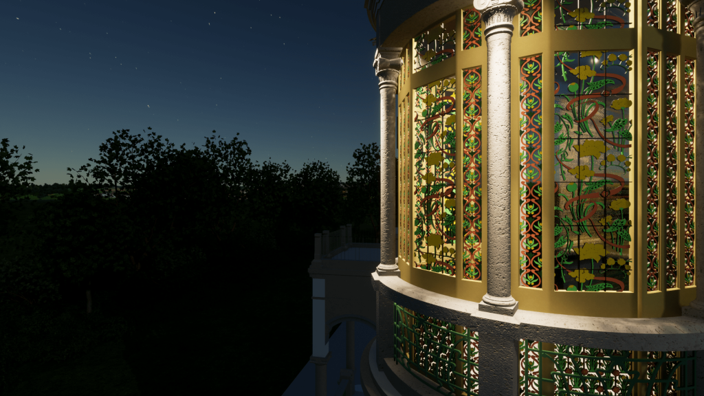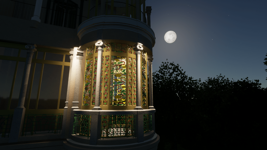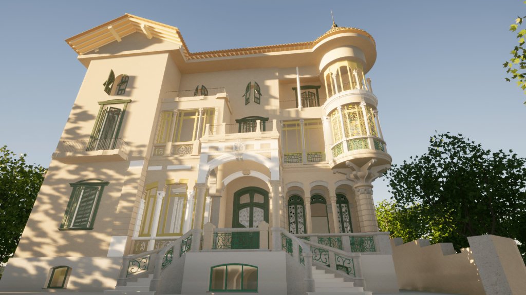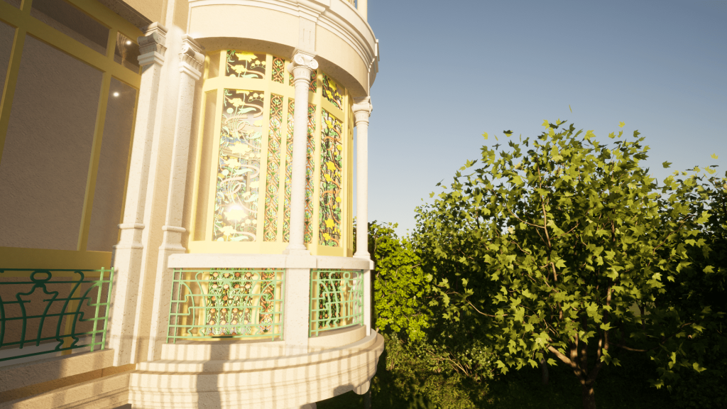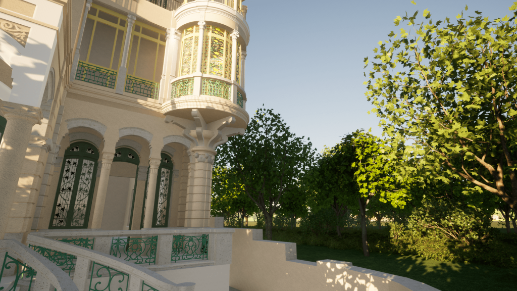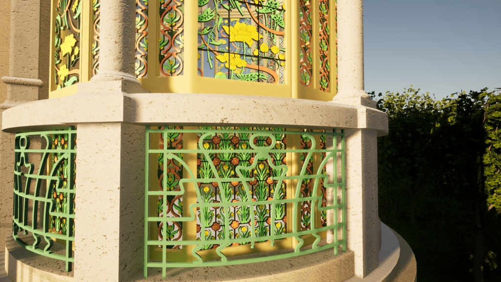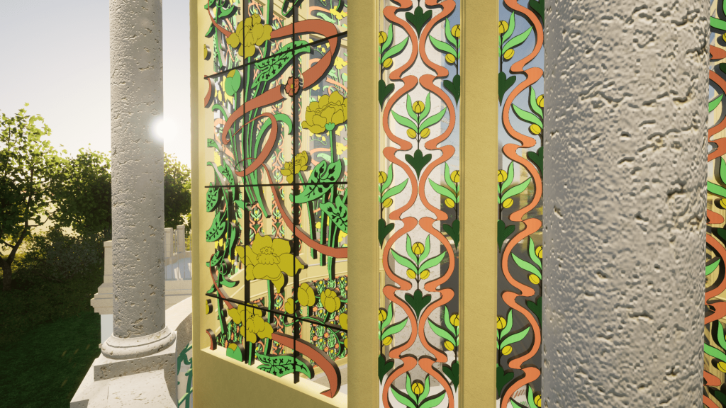 Sulla base del rilievo e della restituzione BIM dello stato di fatto è possibile ricostruire virtualmente il bow window liberty della villa secondo le sue decorazioni originarie.