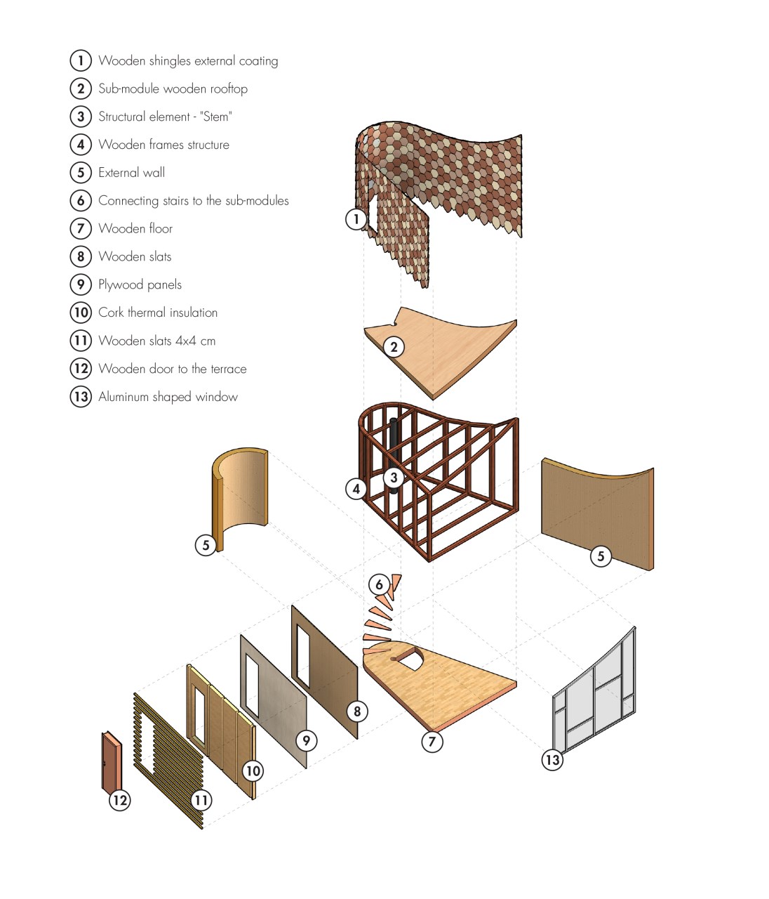 The first idea of the project is to create smaller and identical prefabricated submodules instead of a unique tree module house. Creating more individual spaces allows to make easy transport objects which is possible to move in different places during his life. The complete tree module house is obtained composing these submodules together. As usual in nature, one part is meaningful just in relationship with the others.