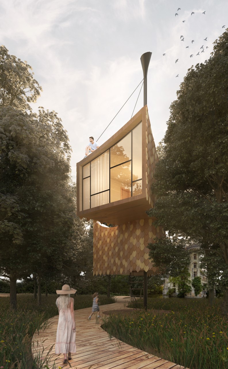 A pedestrian path allows the tree house modules distributed around the ruins of Mothe Chandeniers, l’Ébaupinay and Vibrac to take root on the countryside. It could adapt itself to the morphology of the terrain and the water mirror area, making easier the movability also during the rainy season.