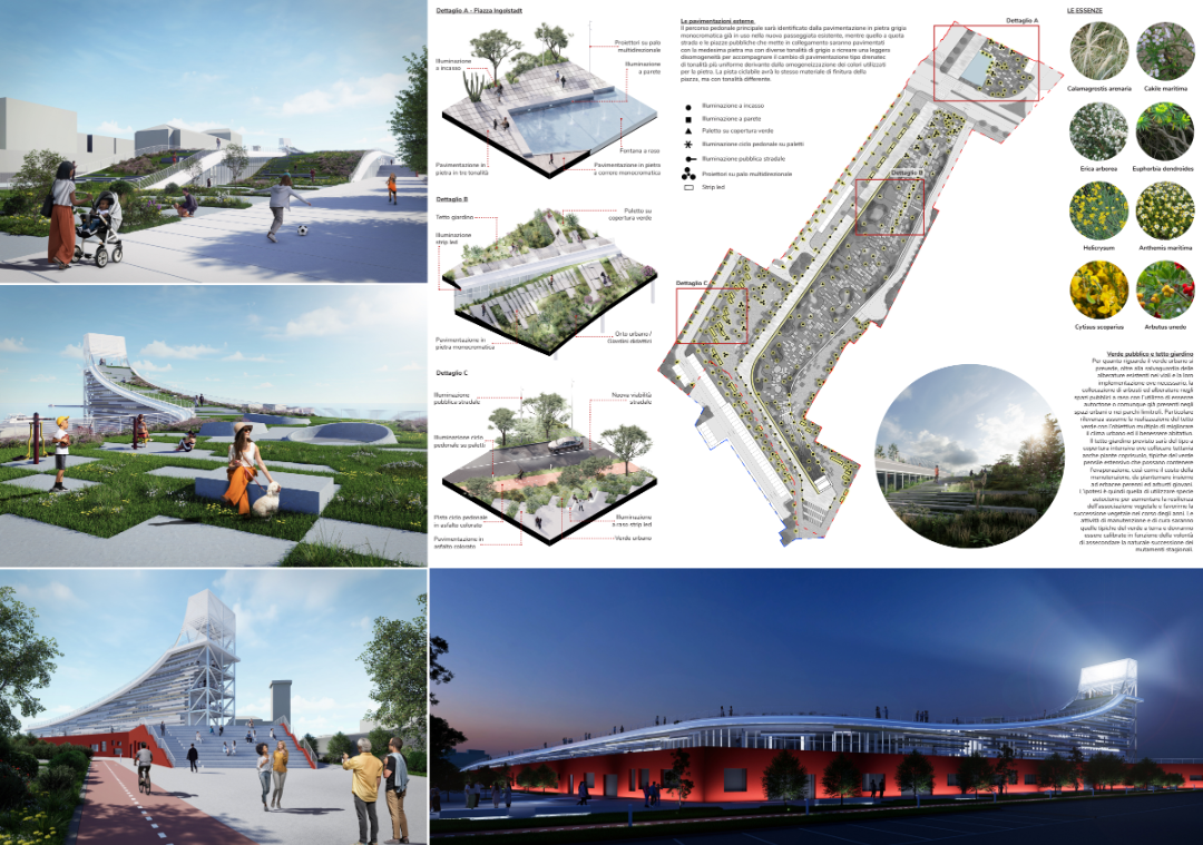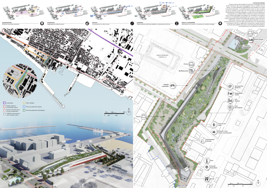 La proposta riorganizza completamente la mobilità lenta con un sistema composto da: percorso pedonale principale, percorso paesaggistico sopraelevato, pista ciclabile connessa ai lotti limitrofi, percorsi urbani a raso arricchiti da piazze e nuove alberature. Questi elementi generano una spina dorsale urbana capace di connettere centro, mare e porto.