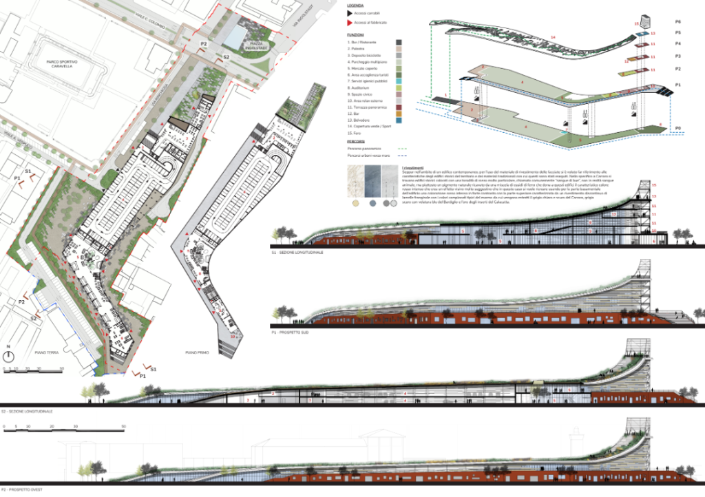 Il cuore del progetto è un edificio multifunzionale che si configura come una vera e propria passeggiata architettonica su più livelli, un percorso fluido che dal centro città conduce alla nuova passeggiata a mare senza interruzioni. L’architettura non è pensata come un volume chiuso, ma come una sequenza di spazi pubblici, rampe verdi, terrazze, punti di sosta e affacci panoramici che si integrano naturalmente nel paesaggio urbano.